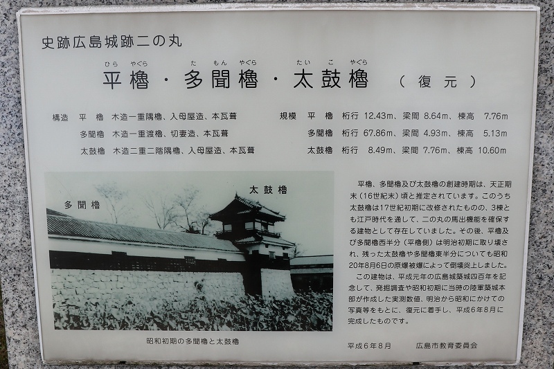 平櫓、多聞櫓、太鼓櫓の創建時期は、天正期末(16世紀末)頃と推定されています。このうち太鼓櫓は17世紀初期に改修されたものの、3棟とも江戸時代を通して、二の丸の馬出機能を確保する建物として存在していました。その後、平櫓及び多聞櫓西半分(平櫓側)は明治初期に取り壊され、残った太鼓櫓や多聞櫓東半分についても昭和20年8月6日の原爆被爆によって倒壊炎上しました。