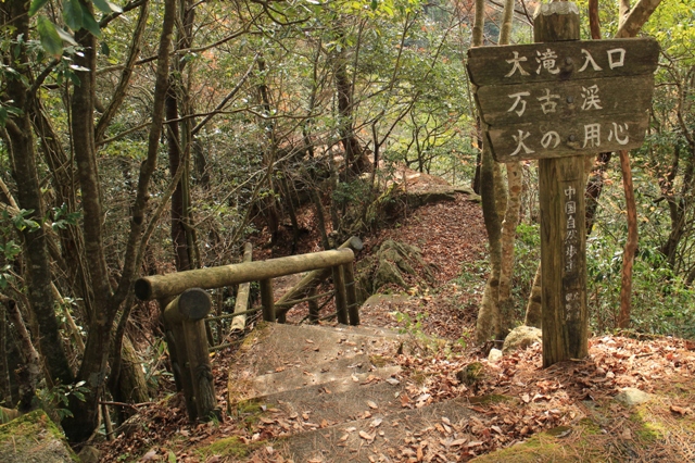 緑の案内板の箇所のガードレールが切れとって、ここを下って万古渓へと向かう。 「ふぶきの滝まで5分」の表示。ゆっくり歩いても10分ありゃ滝までいけるの。